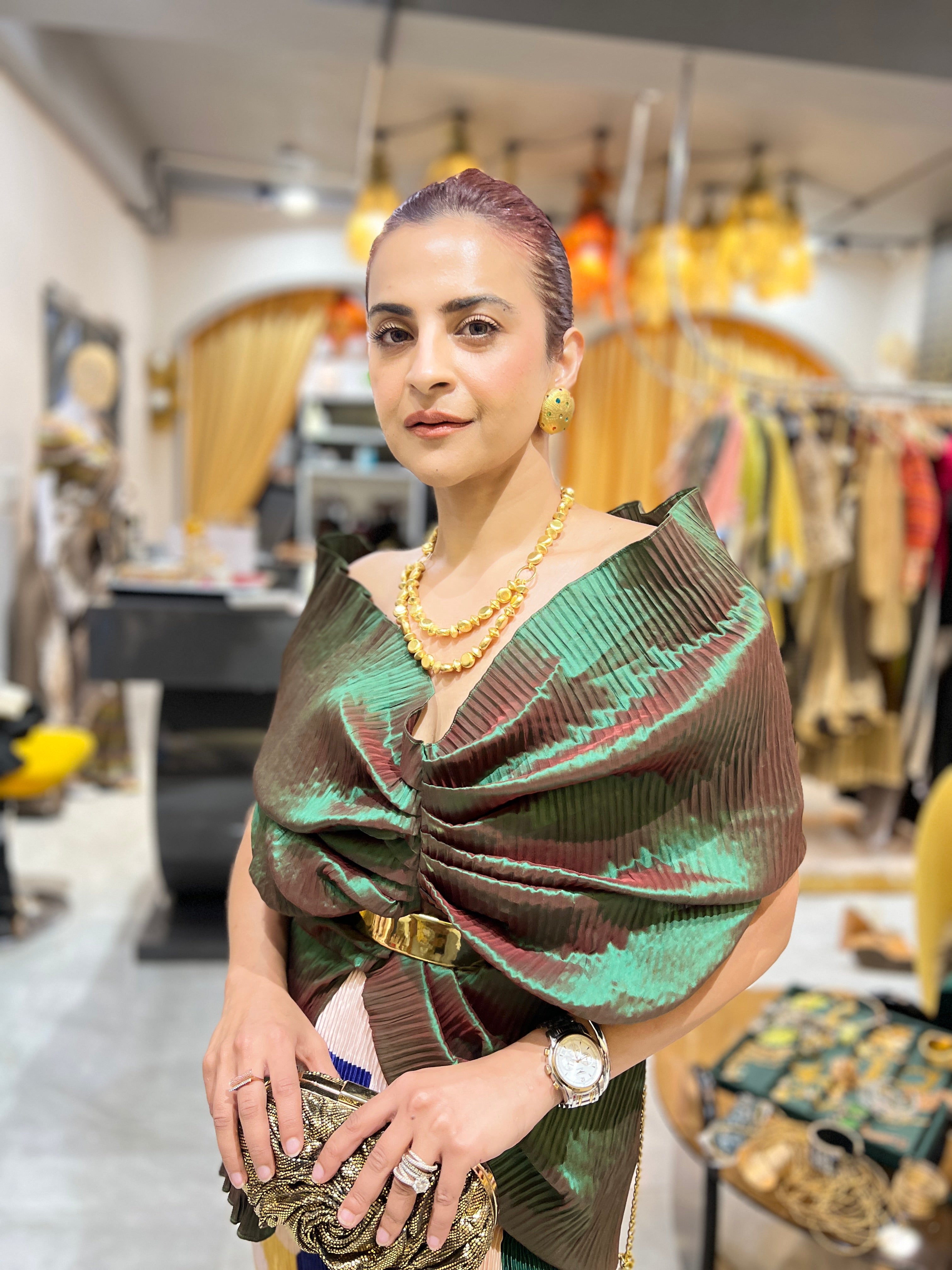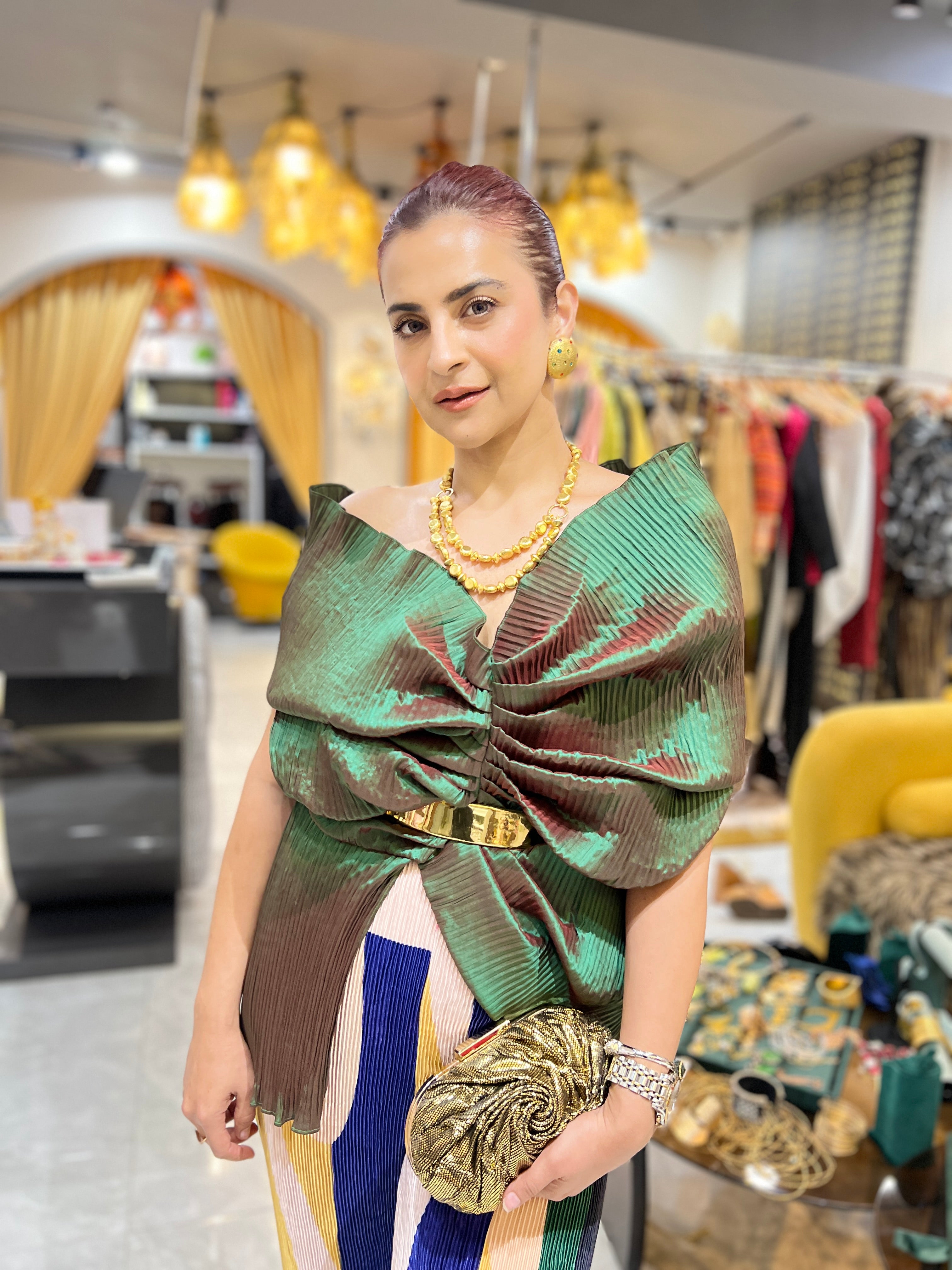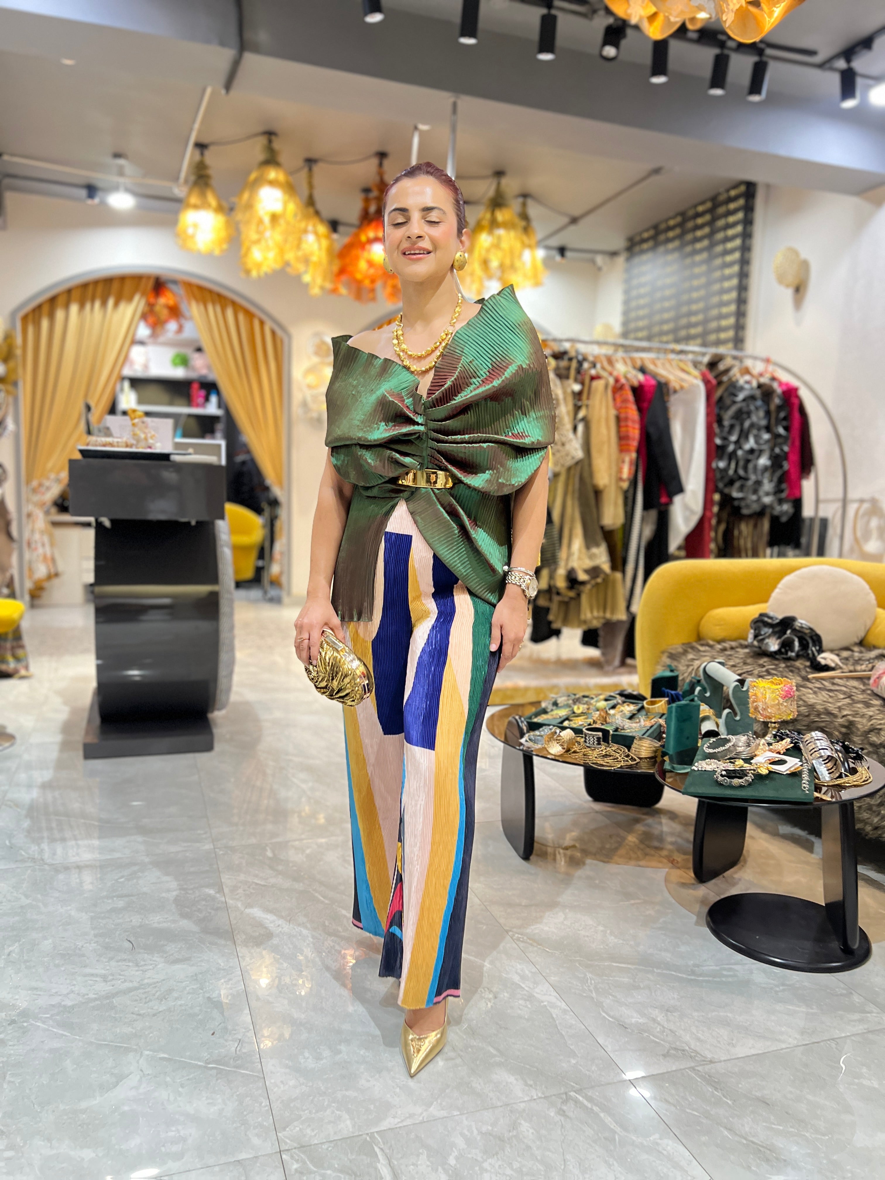 Emerald green Multi drape pants set with belt